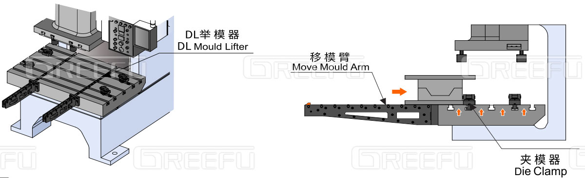 DL (滾輪型),由油壓上升將模具頂起,輕松實現(xiàn)模具移入 / 移出