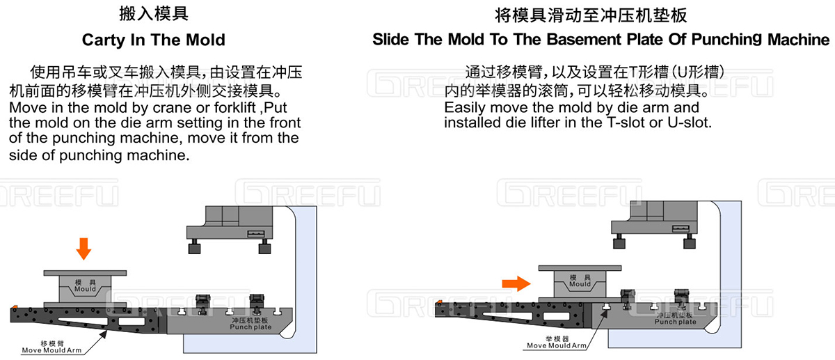 通過移模臂將模具方便的移動(dòng)到?jīng)_壓機(jī)墊板前面 使用吊車或叉車等設(shè)備,安全 順暢地搬入/搬出模具
