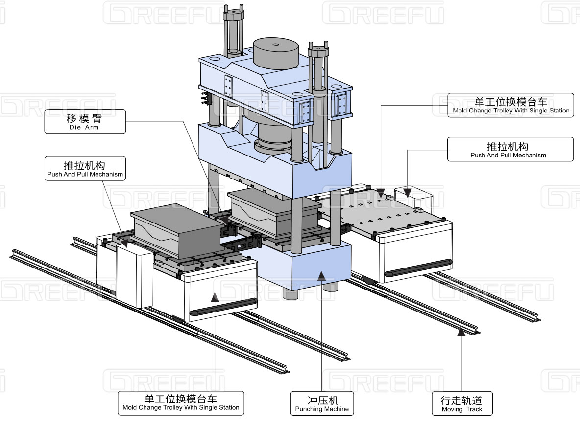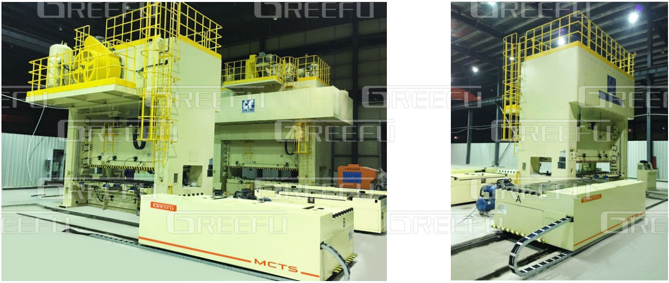 多臺沖床共用一套自動換模臺車系統(tǒng),該“自動換模臺車系統(tǒng)”能有效解決大型模具的換模作業(yè),如汽車鈑金、家電電梯等行業(yè)沖壓零件,且格萊富可依各種獨(dú)立作業(yè)需求研究開發(fā)各種搬運(yùn)臺車,并可設(shè)計(jì)單鍵全自動或半自動對模具的搬入搬出,同時(shí),現(xiàn)在該模具輸送系統(tǒng)也已逐漸被業(yè)內(nèi)接受與采用,尤其是,汽機(jī)車零組件等需大型模具的制造業(yè)等。