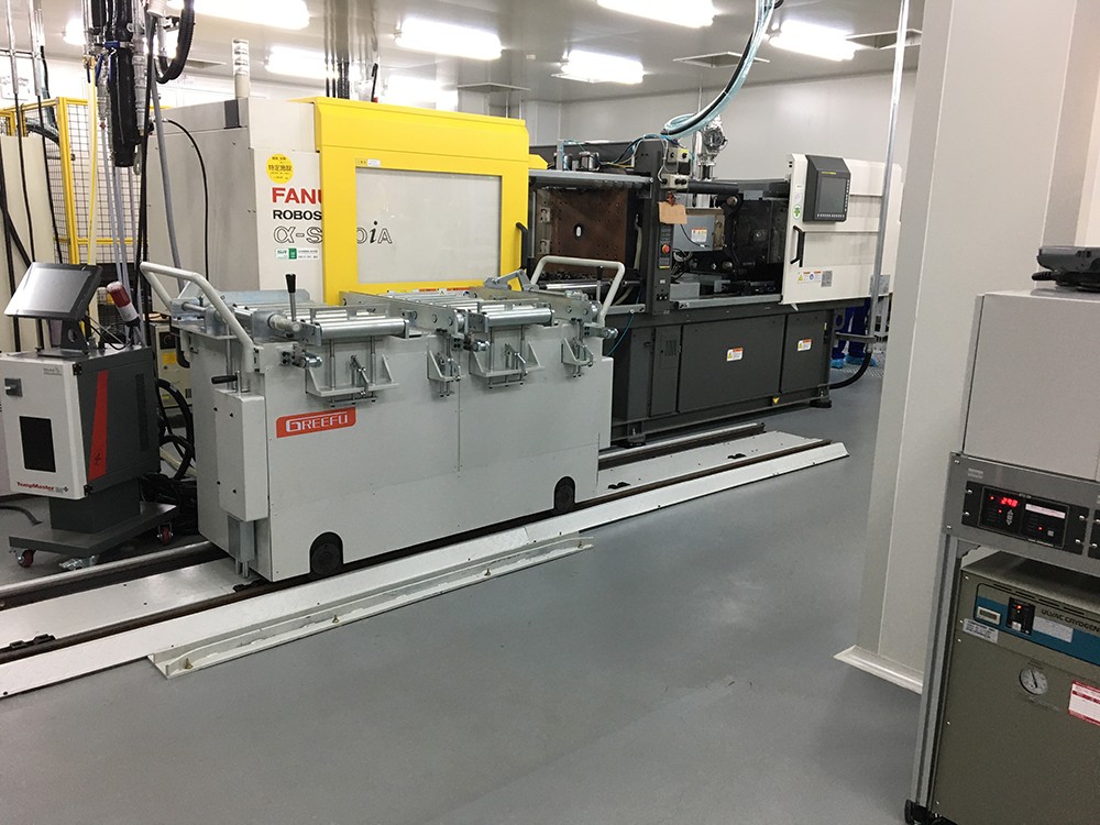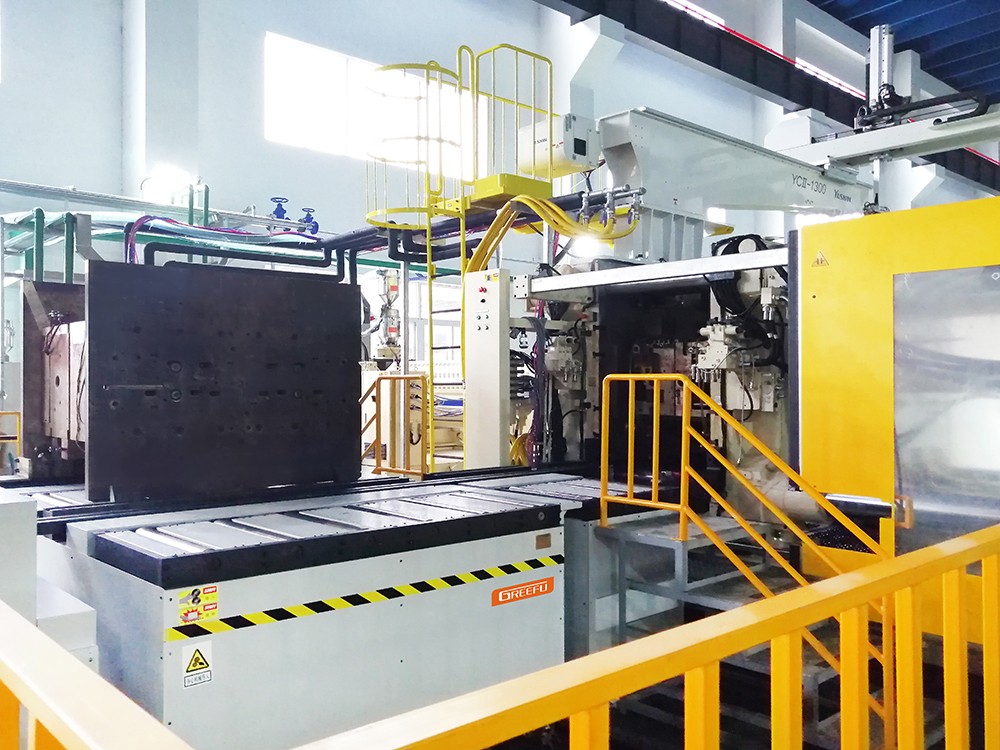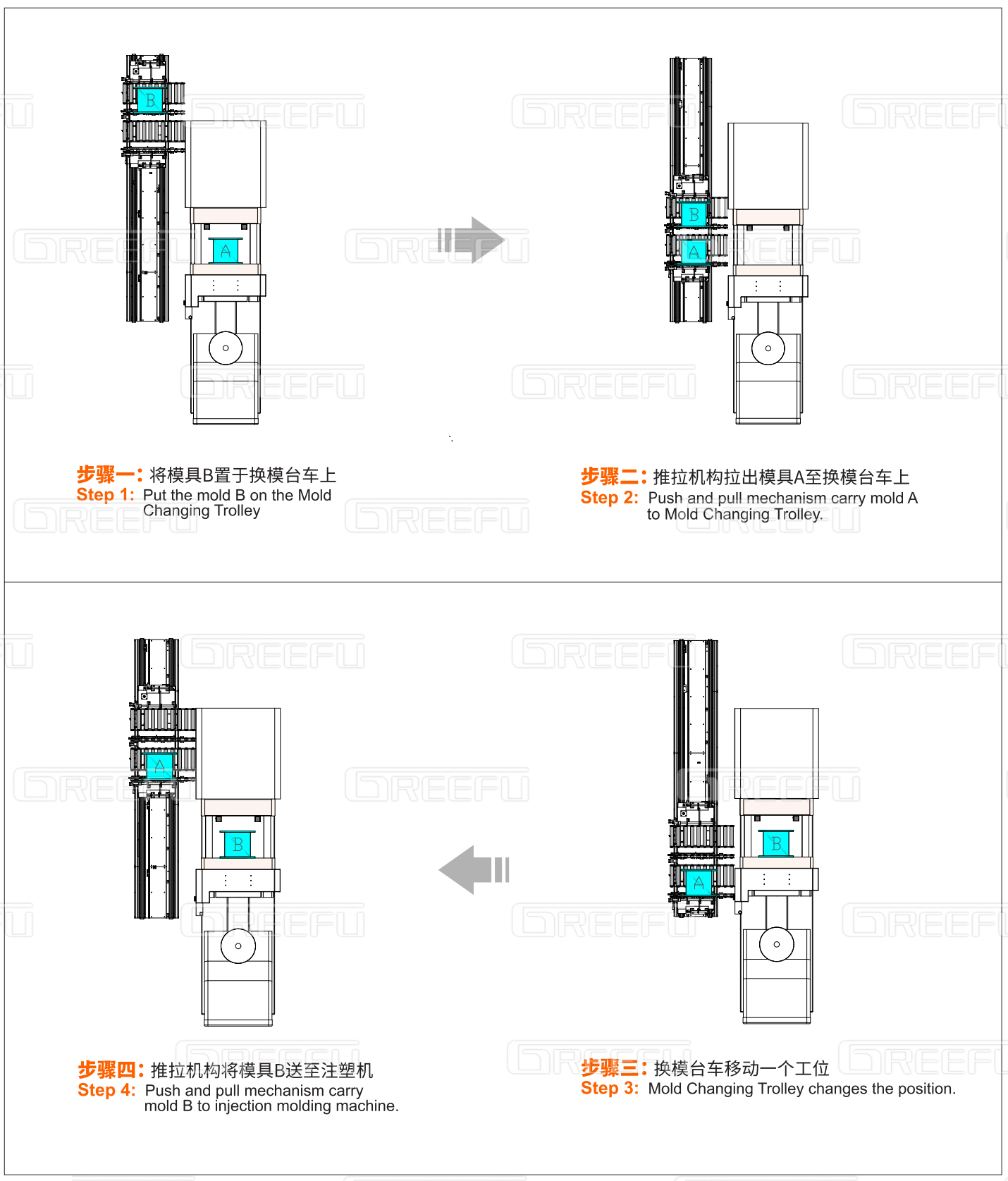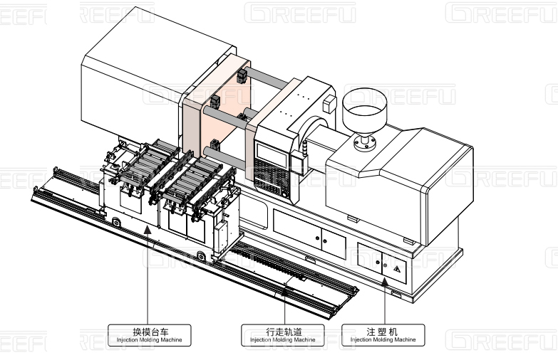 多臺(tái)注塑機(jī)共用一套自動(dòng)換模臺(tái)車(chē)系統(tǒng),該“自動(dòng)換模臺(tái)車(chē)系統(tǒng)”能有效解決大型模具的換模作業(yè),如汽車(chē)鈑金、家電電梯等行業(yè)沖壓零件,且格萊富可依各種獨(dú)立作業(yè)需求研究開(kāi)發(fā)各種搬運(yùn)臺(tái)車(chē),并可設(shè)計(jì)單鍵全自動(dòng)或半自動(dòng)對(duì)模具的搬入搬出,同時(shí),現(xiàn)在該模具輸送系統(tǒng)也已逐漸被業(yè)內(nèi)接受與采用,尤其是,汽機(jī)車(chē)零組件等需大型模具的制造業(yè)等。